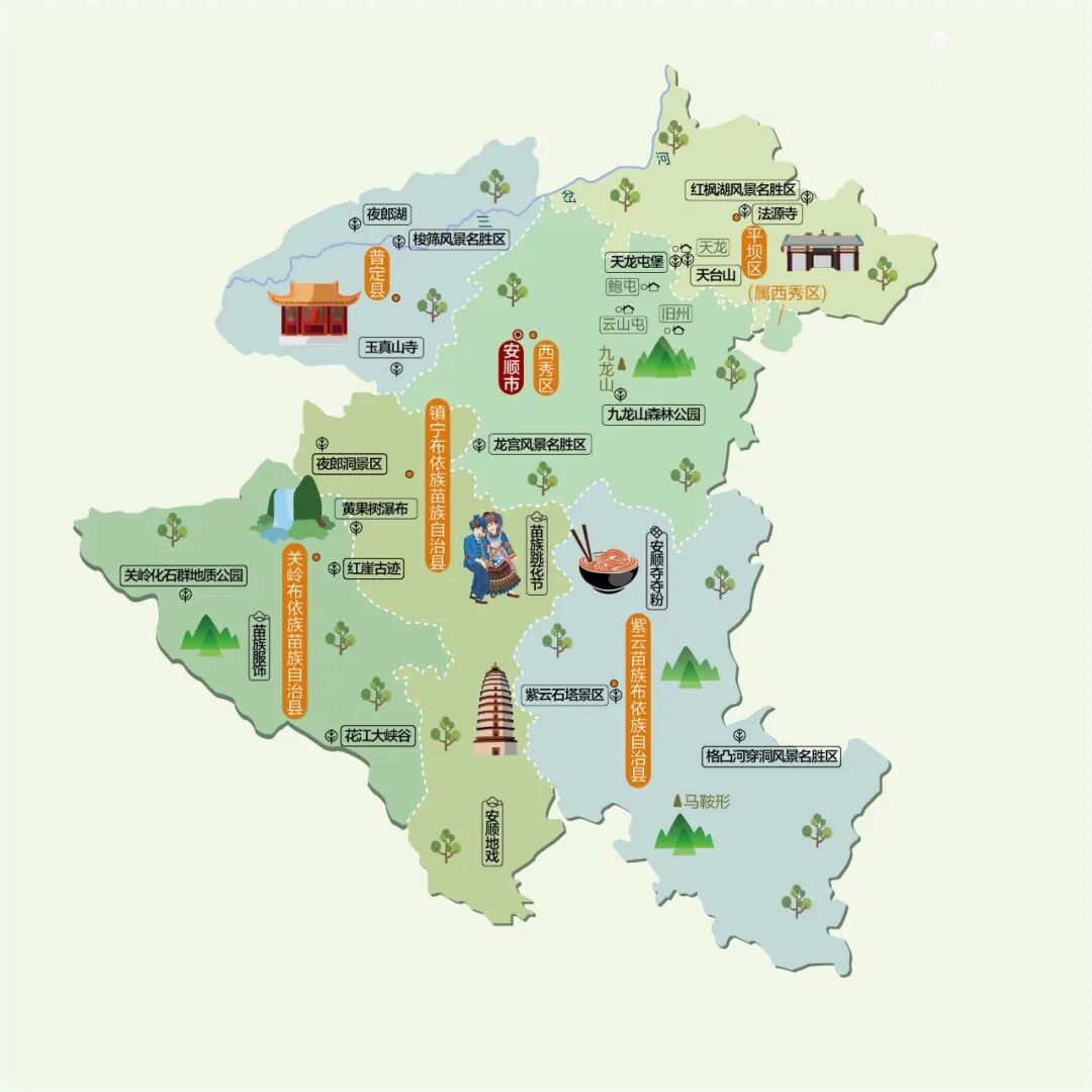 发表时间:2023-10-22 10:13 安顺市下辖2区(西秀区、平坝区),1县(普定县),3自治县(镇宁布依族苗族自治县、紫云苗族布依族自治县、关岭布依族苗族自治县)。