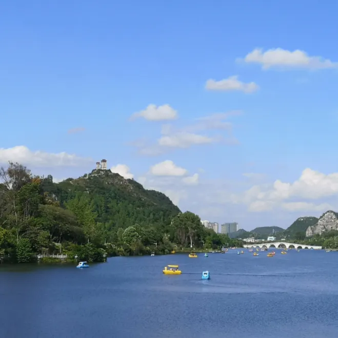 5.格凸河风景名胜区 格凸河风景名胜区,集山、水、林、洞、石等为一体,以雄、奇、险、峻、幽、古等特色著称,是一处拥有美丽的喀斯特地貌的自然公园。 6.旧州古镇 旧州古镇是黔中文化发源地,地处安顺市西秀区旧州镇,在春秋时期时属并舸国辖地,战国时为夜郎国属地,元朝时设为安顺州。明朝成化年间州治所迁往今安顺城,直至清末仍为安顺军民府亲辖地。旧州古镇于2006年被评为贵州省级历史文化名镇。 7.云峰八寨 云峰八寨地处安顺市西秀区七眼桥镇,由云山屯、本寨、雷屯、小山寨等八个屯堡村寨组成,它是明初南大军屯驻的核心区。在方圆11平方千米的青山绿水间,八个村寨分布有序,疏密得当,既可各自为战又能彼此为援,堪称军事防御体系的杰作。每个寨子都建有寨墙、碉楼,石头外墙包裹着的江南民居风格的四合院鳞次栉比,巷巷相通、户户相连,既适宜人居又利巷战,被学者誉为"冷兵器时代的最后堡垒"。 云峰八寨中保存最好的是云山屯和本寨。云山屯坐落在云鹫山半山腰的一片狭长山谷中,地势险要。从屯门开始,一条石板古道贯穿整个村落,街道两侧分布着明代、清代和民国时期不同风格的建筑。本寨坐落于云鹫山脚下,有穿过田间的小路与山上的云山屯贯通。走进本寨最吸引人目光的是错落的石板屋顶上那七座高矮不一的碉楼。时过境迁,这些为保卫村寨立下汗马功劳的碉楼早已变成本寨人家居住或堆放杂物的地方。如果想要去参观碉楼的内部,需要和屋主协商。 8.关岭化石群国家地质公园 关岭化石群国家地质公园位于安顺市关岭自治县新铺乡,这里有大量2.5亿年前生物大灭绝前的古生物化石,体形完整,形态精美,是一处极具观赏价值的旅游胜地和科考价值的研究基地。关岭化石群保存在黑色泥岩和页岩之中,主要化石门类包括:大量完美保存的海生爬行动物(鱼龙、海龙、楯齿龙、龟)、海百合以及菊石、双壳类、牙形石、鹦鹉螺、腕足类、鱼类、鲨鱼牙齿和来自附近陆地的古植物。关岭化石群国家地质公园博物馆可通过图片、模型、影视、实物等形式,向观众全面展示关岭化石群的形成、发展、演变过程。 9.花江大峡谷 花江大峡谷长约80千米,总面积约300平方千米,是国内最长的峡谷。共分为5个景区,即夹山景区、铁索桥景区、下瓜寨景区、盘江桥景区和古生物化石景区。拥有自然、人文景观以及民族村寨景观。谷内有花江河奔腾而过,两岸峰峦叠翠,山上古木、藤蔓丛生,再加上历史悠久的文物古迹,使这里成为一处不可多得的观光休闲胜地。 10.夜郎湖风景区 夜郎湖风景区位于安顺市普定县境内,夜郎湖景区由夜郎湖、火焰山原始植物保护区、国家重点文物保护单位穿洞古人类遗址、莲花古洞等景点构成。 中心景区夜郎湖,湖区全长约42千米,有半岛、岛屿、湖湾上百个,主要景点有双龙峡、剑门峡、虎跳峡,还有堪称中国第一坝、世界第一高的碾压式砼拱坝。