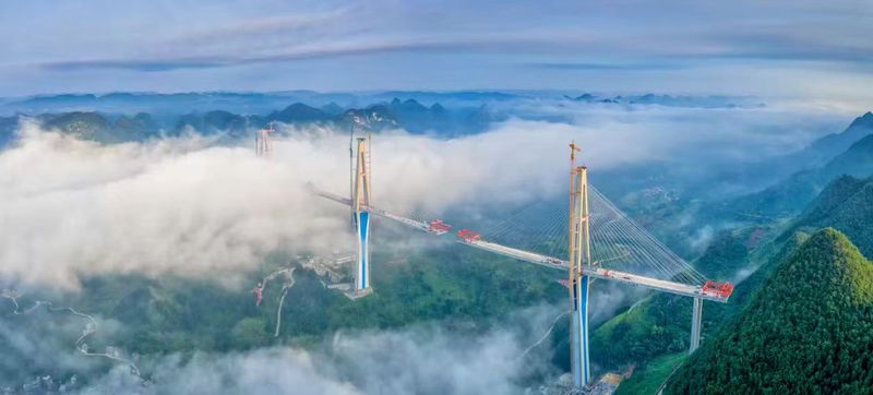 随后驱车前往天空之桥。它是世界最高混泥土塔桥——平塘特大桥横跨峡谷两岸,大桥首次采用了造型优美的空间钻石形索塔,桥下是平里河,河面最宽处达到百米,河谷的地形也让桥下雨雾天气较多,雾天的大桥就像飘在空中一样,因此平塘特大桥也被称为“天空之桥”。