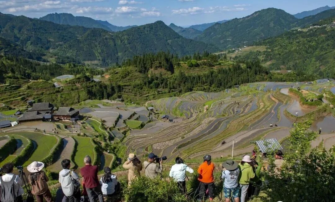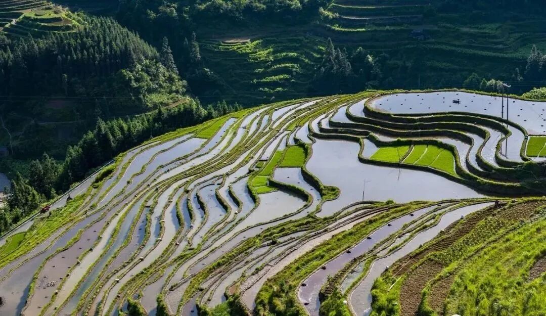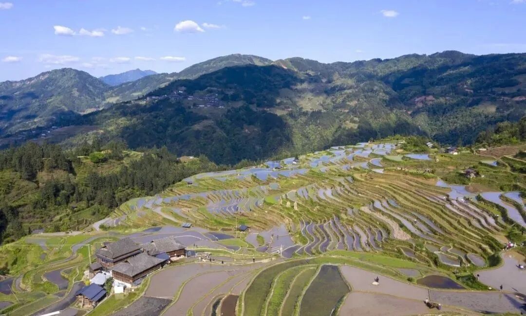 加榜梯田,位于贵州黔东南苗族侗族自治州从江县中西部月亮山腹地的加榜乡东北面,占地面积近1平方公里以内。据本地广大苗族地区老年人口传,广大苗族地区老祖先迁移到这儿后,用棍子和石器时代沿着地势开垦拓田,祖祖辈辈不辞辛劳耕种留下现在的加榜梯田,至今已有数千年历史。初夏时节,田园储水丰硕,色彩缤纷,像一面面“大地的浴室镜子”嵌入成一幅美丽的画卷。