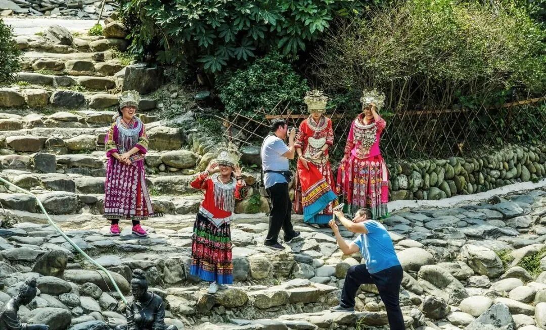 三、我国苗都-西江千户苗寨“石冈凝寒月,铁手黎明风”,初见苗寨,是小时候出现在了黑白电视中的金庸小说的小说中。活泼可爱绝代佳人的苗疆少女,和曲槛神殿、瓦绿葱郁的吊角楼。而西江千户苗寨,是当前世界最大的广大苗族地区集中地。 西江千户苗寨,位于贵州黔东南苗族侗族自治州雷山县西江镇北贵村。由10好几个依山而建,规模大的苗族村寨构成。绝美的白水河穿寨经过,青山绿水、田园直联云水间。绝美的西江,千户苗寨朴素又很清澈的世外桃园。